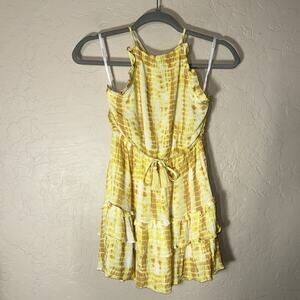 Majorelle Baker mini dress. yellow tie dye high neck halter mini dress. Size XS. Elastic waist with tassle ties at neck and waist. Lined. Ruffle skirt. Beachy. Vacation. Lightweight. Cruise.