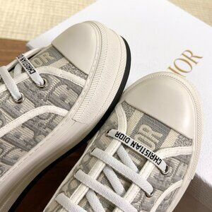 These Dior sneakers feature a sleek gray design, crafted with a durable canvas upper and a distinct rubber toe cap for added style. The white rubber soles provide excellent traction, making them perfect for everyday wear. With their classic lace-up design, these sneakers offer both comfort and a modern aesthetic.