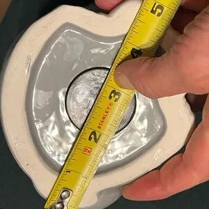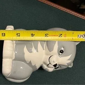 Handmade ceramic kitty coin bank. Kitty is gray with white markings slot for coins is on back of head. Bank measure 6 inches tall by 5 inches at widest part of base. This kitty‘s face is adorable done very well by the maker not marked. Great preowned condition.