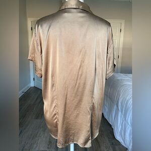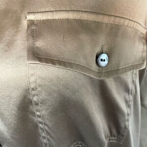 Beautiful Taupe Gold Short sleeve button front blouse with two front pockets. 95% silk/5% Spandex.
