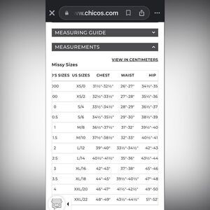 Please refer to size chart for Chico’s sizes
