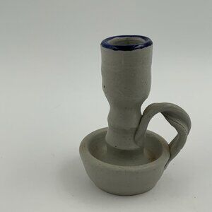 This beautiful candle holder from Williamsburg Pottery is a stunning addition to any room. With a height of 4 inches and a width of 3 inches, it is suitable for taper or dinner candles and is perfect for creating a cozy and inviting atmosphere. The salt glaze finish gives it a unique and authentic look, while the abstract carvings add a touch of artistic flair. Crafted by hand using the pottery production technique, this vintage original is an impressive piece of art pottery that will stand the test of time. The gray blue color and cobalt blue detail make it a perfect fit for any decor. This candle holder is an original and licensed reproduction from the United States, with an impressed backstamp and a weight of 9 1/2 ounces.