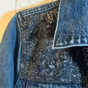 Gap 1969 women’s small blue Jean jacket with black floral design. Destressed. Made in China.