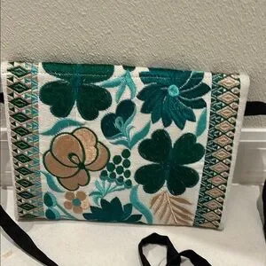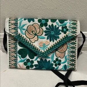 Elegant floral embroidered clutch bag in green and cream. Perfect for adding a touch of sophistication to any outfit.