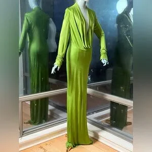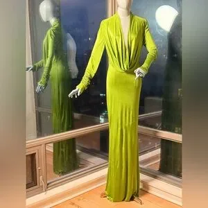 A dreamy, silky, sexy column dress in green with a plunge cowl neckline and closed back. Style Octavia with gold accessories, and add a skinny heel to emphasize the pavement-grazing length.