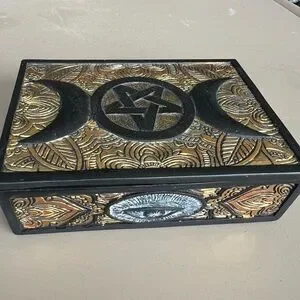 Intricately designed box with black and gold patterns. Features unique symbols and artistic details.