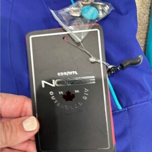 Royal blue jacket, with turquoise accents and matching turquoise snow pants with suspenders
