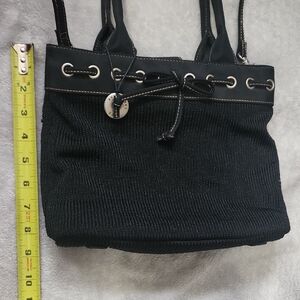 This black tote bag combines a classic design with modern functionality, featuring silver-toned accents and durable handles for easy carrying. Its medium size and structured shape make it perfect for everyday use, while the decorative charm adds a touch of elegance.