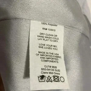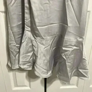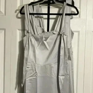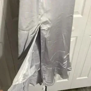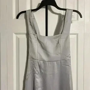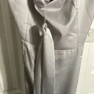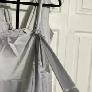 Polyester shiny satin silvery gray dress with a Square neckline, an elastic waist - elastic gathered back and Ankle Length. Slit front one side. Lined. Ties for straps shows in back and front or leave off - detachable can put in front or back - extra attached to inside to label.