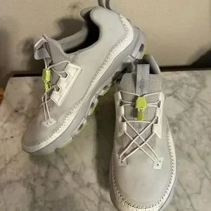 Stylish athletic sneakers in white and gray with neon green accents. Perfect for sports and casual wear. Great condition.