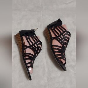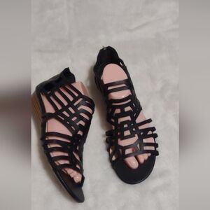 These Liz Claiborne sandals feature a striking gladiator-inspired design with intricate black straps and a contrasting pink footbed. The slight wedge sole adds a touch of height, making them perfect for both casual and dressy occasions.