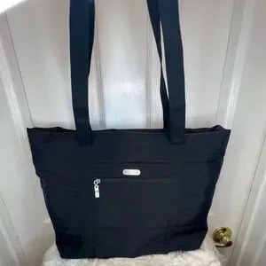 The Baggallini large travel tote bag, in a classic black shade, is crafted from a robust material, offering generous space for your belongings. Its sleek rectangular design and comfortable shoulder straps make it an ideal choice for everyday use.