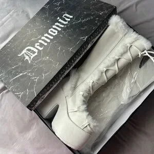 Step out in style with Demonia's white platform boots, featuring luxurious faux fur trim. Perfect for making a bold fashion statement. ‼️WORN ONLY TWICE‼️