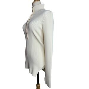 This is an easy long-sleeve pullover in ribbed rayon-blend, featuring a button-up henley placket with a high-mock-turtleneck. Slightly longer in the back with side slits.