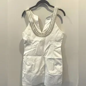 Sleeveless design with a scoop back, a concealed back zipper closure, and a straight hemline.