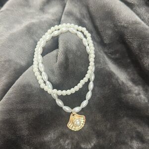 Chic anklet with white pearls and gold shell charm. Perfect for adding elegance to any outfit.