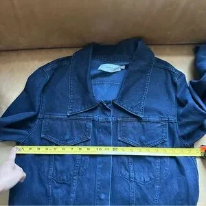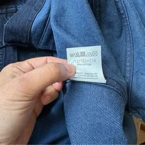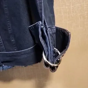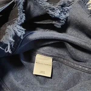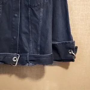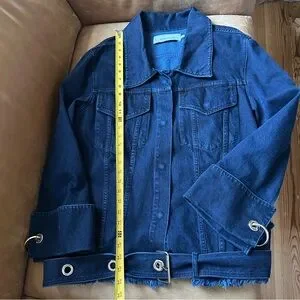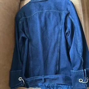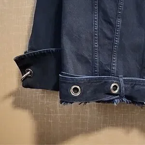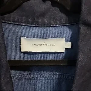 Really cool dark denim jacket by Marques Almeida. Has super cool metal ring detail on both arms and a grommet belt. Has a cool designer oversized fit that is super versatile to wear.