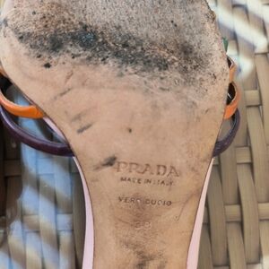 Genuine leather Prada chick heeled sandals with multicolor straps.