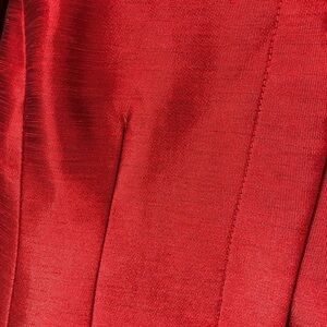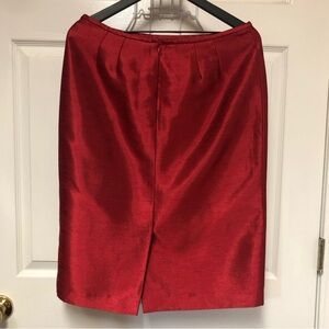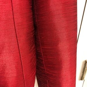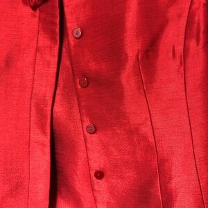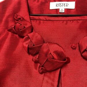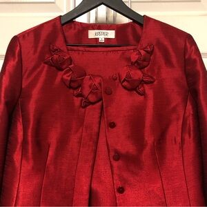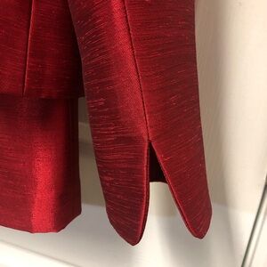 Kasper Two Piece Formal Cranberry Women’s Suit. Floral design around neckline. Five hidden button closure. Long sleeves. Slits on sleeves. Soft fabric. Fabric does not stretch. Padded shoulders. Fully lined. Skirt has back split. Back zipper with hook & eye closure. Size Ten