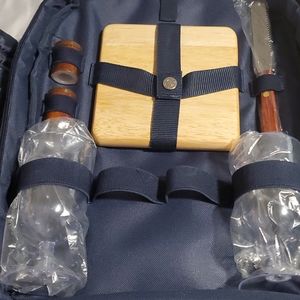 Blue cloth materiel backpack shoulder pads for comfort wine tube tube insulated that comes off one compartment thats insulated for food open and look what you get plates napkins wine glasses wine opener salt pepper cutting board ❤ head turner bring a blanket wine done all there gorgeous looks like suitcase and I love frontgate xo any questions ask me comes boxed dark blue white tons of zippers silver new wrapped fits all trust me classy with handle also washable romantic romance for two