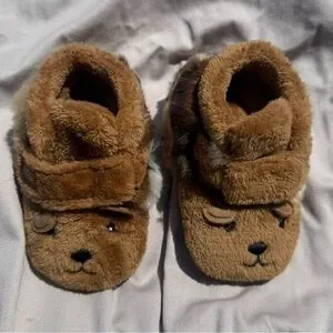 Adorable UGG baby booties with a bear design. Soft and cozy in brown.