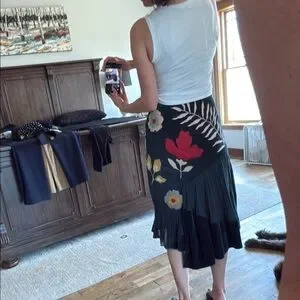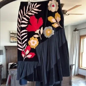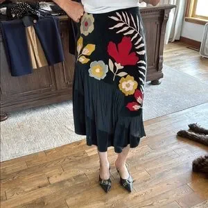 Elegant black skirt featuring vibrant floral embroidery. Perfect for adding a touch of color to your wardrobe.