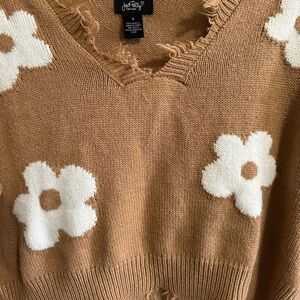 Just Polly Distressed Flower Sweater S (PTP 29) Tan V-Neck Daisy Oversized