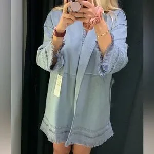 Blue fringed faux-suede jacket Gorgeous dusty colour, suede-look jacket with tassels from Zara. Details on neckline, sleeves and hem. Two regular pockets. Please note the jacket is lightweight and not lined.