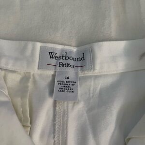 Comfy and classic white shorts by Westbound Petites. Great everyday staple with a clean look. There’s a small stain on the inside right side—doesn’t show when worn (see photos).