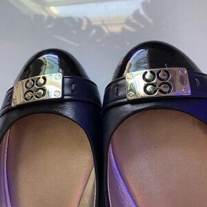 Elegant Coach flats featuring a sleek black design with stylish silver accents. Perfect for any occasion, these shoes offer both comfort and sophistication. In great condition, worn only couple of times for very short time.
