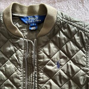 Stylish olive quilted bomber jacket by Ralph Lauren. Features a classic design with ribbed cuffs and hem.