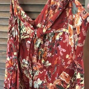 Elegant red maxi dress with floral pattern, has open back with scarf tie . Perfect for outdoor parties and picnics .