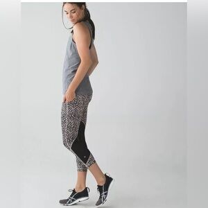 Elevate your activewear game with these Lululemon Women's Pace Rival Cropped Leggings in Size 6. The brown and black spotted pattern adds a touch of style to your workout wardrobe. The pull-on closure and rear zip pocket make them convenient for cross training, dance, or CrossFit activities.