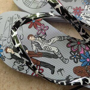 These comfortable flip-flop sandals are perfect for a Star Wars fan! From Vera Bradley's 2022 Star Wars collection, this pattern is called Far Far Away Light Vs. Dark — a colorful floral design featuring beloved characters on a gray background, with spaceships on the thong/strap. Shoes are like new — I purchased NWT and removed the tags, but then realized they're too big for me. Only worn around the house and once out to my car in the driveway. Size large or 9/10.
