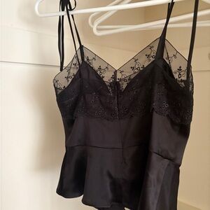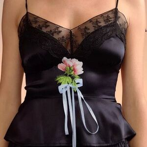 Cynthia Rowley lace-trim silk cami features a screen-printed floral motif and self-tie grosgrain ribbons V neckline Sleeveless Self-tie shoulder straps Empire waist Peplum hem Slim fit Invisible side zipper Silk Imported.