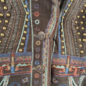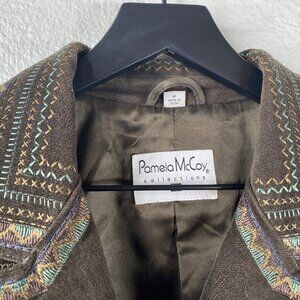 Great Pre-owned Condition Pamela McCoy Coat Women's Brown Sz M Embroidered Studded Boho Ecletic Mid Length