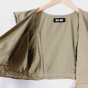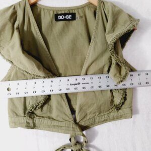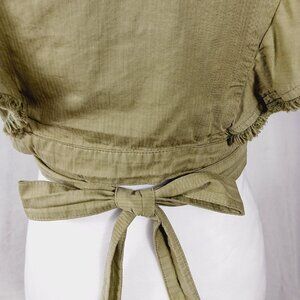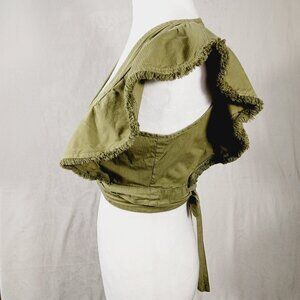 DO + BE, Khaki Green Crop Top, Small, Wrap Tie Waist, Ruffled Sleeves with Frayed Edges, Cotton, Festival, Beachy, Party, Boho, Bohemian. In excellent pre-owned condition.