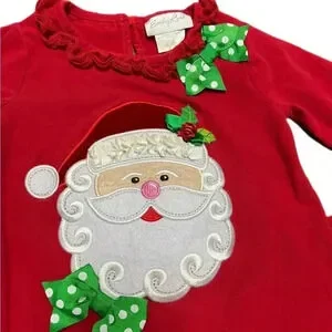 Red Christmas outfit by Emily Rose in size 5. This outfit has a textured Santa on the front with green bows. It has ruffles on the sleeves and pant legs as well as the hemline of the shirt.