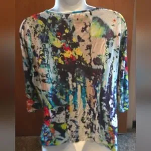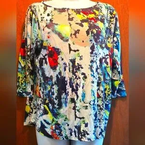 This is a vibrant multicolor abstract women's top with a unique watercolor artistic design. This gorgeous piece has a boatneck, leckline, 3/4" sleeves, and a rounded hemline. It is very stretchy and soft. This is a beautiful item that is gently tested with no defects other than the tag being loose. This is perfect for adding a splash of color to your wardrobe. The approximate unstretched measurements;