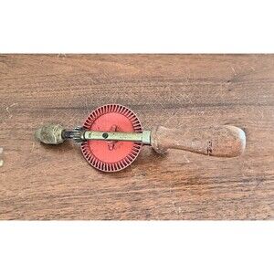 Vintage eggbeater style hand drill. Wood and cast iron. Marked made in USA. 11 inches long. Good usable condition with some age wear.