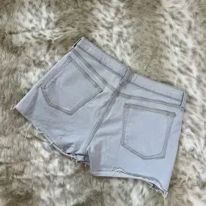 These light blue jean shorts from rag & bone feature a high-waisted design with a stylish frayed hem, perfect for a casual day out. Crafted from traditional denim, they offer a fitted silhouette that complements any look. In excellent preowned condition.