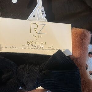 Adorable Rachel Zoe baby outfit featuring a leopard print onesie, faux fur vest, and black pants. Includes stylish sunglasses and a bow tie.