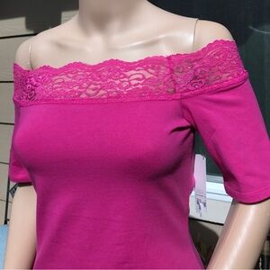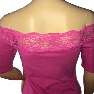 Stylish pink off-shoulder top with lace detailing. Perfect for a chic look.