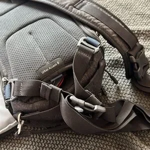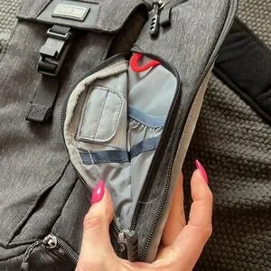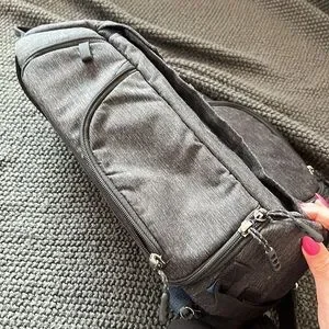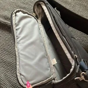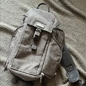 Ambidextrous sling back with multiple pockets for camera gear and a waist strap and hidden rain protector. Very good condition!