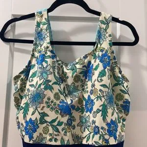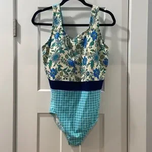 EUC Women’s Lands End One-Piece Blue Floral Gingham Check Swim Bathing Suit 18W