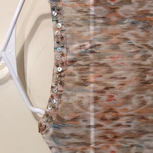 Featuring an eye-catching abstract print and embellished with beads and rhinestones, this tunic will add a touch of elegance & fun to any outfit.
