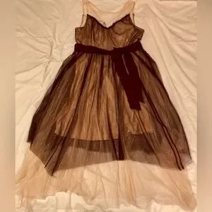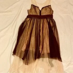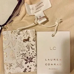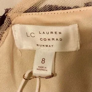 BNWT Gorgeous Fall 2017 Lauren Conrad dress. Still has tags! Cream and brown/wine tulle layered dress. Sweetheart illusion neckline. Many layers of sheer,ethereal tulle. Shark bite asymmetrical hem. Matching liner attached. Matching belt. Stretchy waistband. Zipper and hook closure in back. So romantic and flattering. Never worn. Size 8