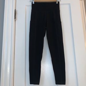 Original owner. Black high waisted leggings with side pockets. In excellent, clean condition! The white you see on the back is the thread from the original store tag.