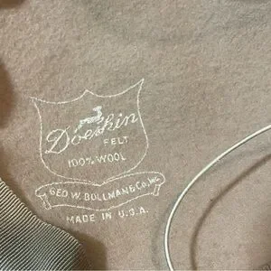 Elastic chin strap. Doeskin felt 100%wool cap. Great condition. Large ribbon bow in back attached.