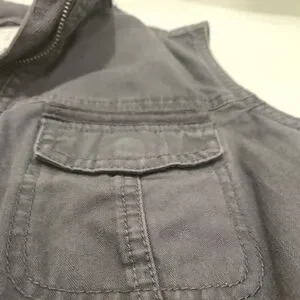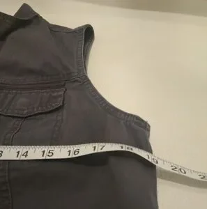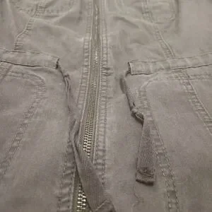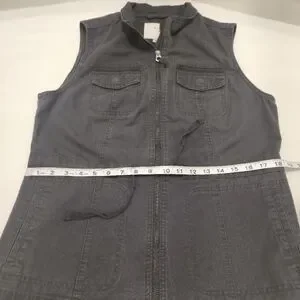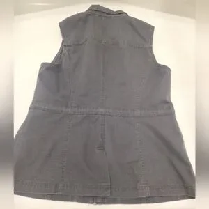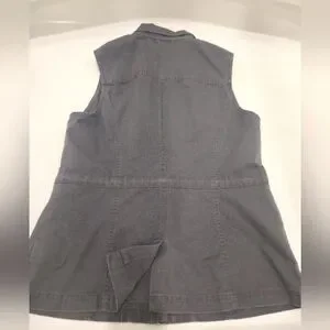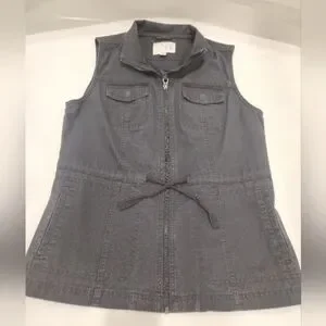 Stylish women's gray sleeveless vest with zip-up front and tie waist. Features two chest pockets and two side pockets.